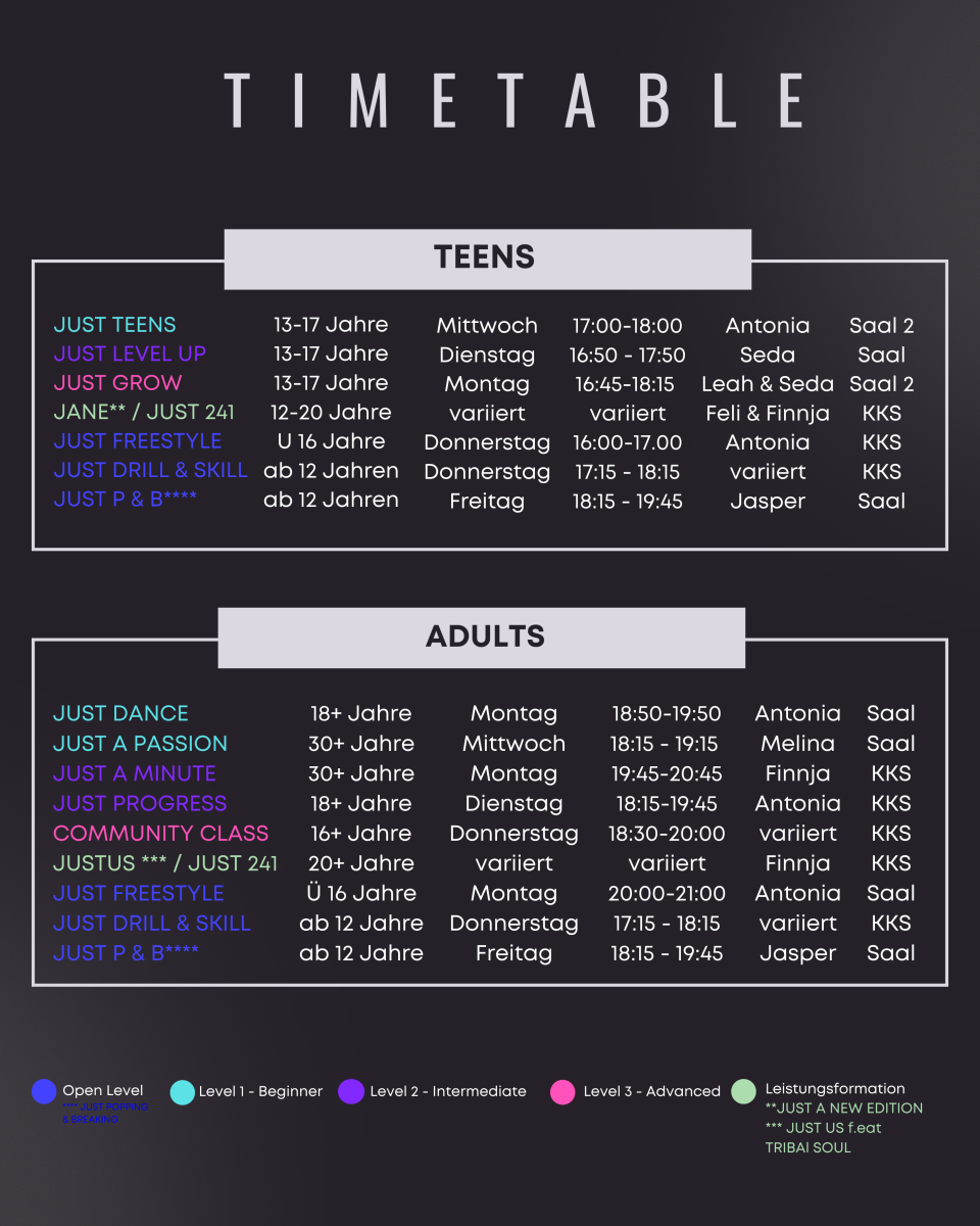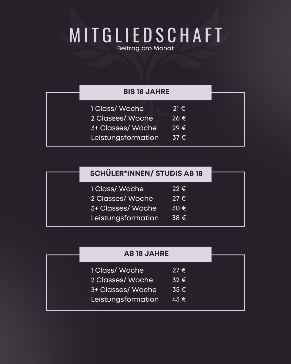 In den Gruppen ist ein Probetraining nur auf Anfrage möglich. Schreib uns gerne eine Mail und starte zum Kennenlernen in einem unserer Kurse, und vielleicht stehst auch du schon bald mit uns auf der Bühne.